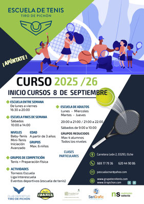 Nuestra escuela de tenis se inició en octubre del año 1991. La escuela de tenis del Club Deportivo Tiro de Pichón Elche atiende las necesidades y demandas de los socios del club. También se admiten alumnos no socios del Club.